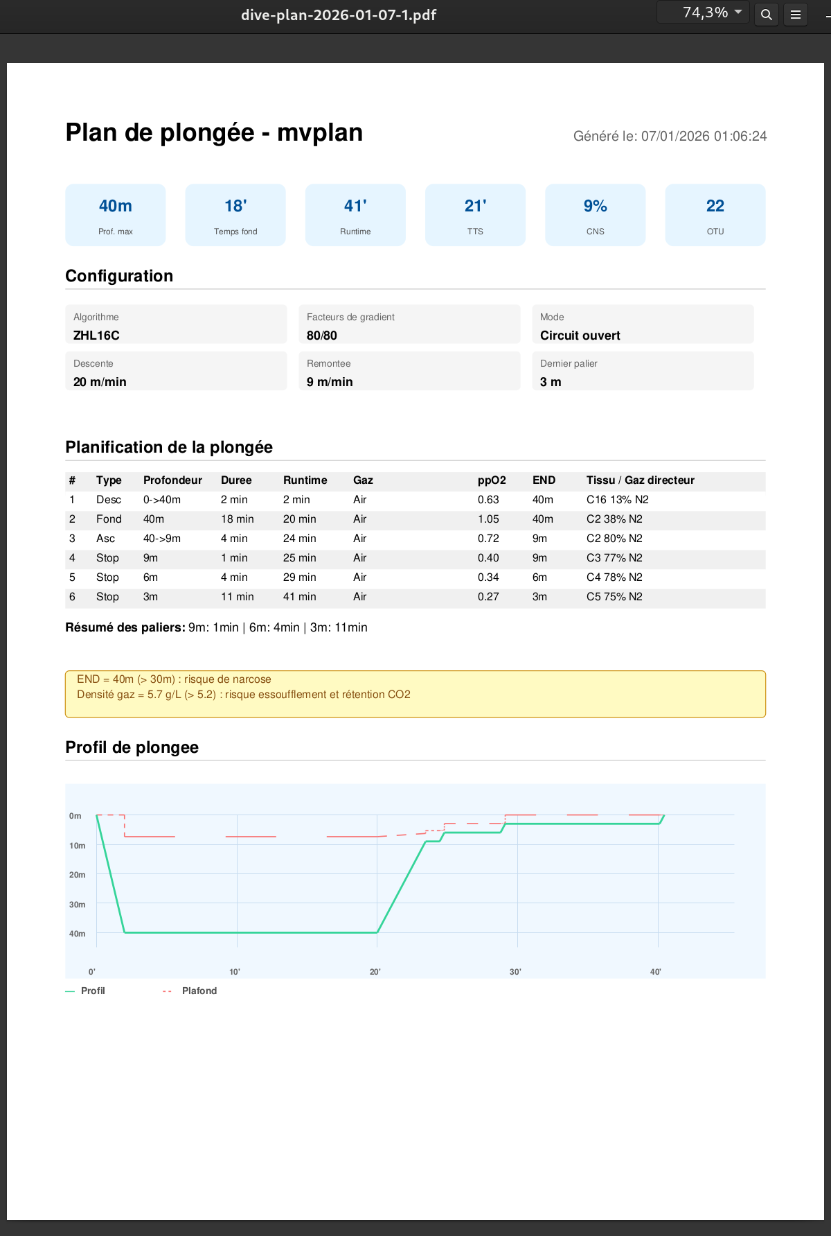 - implémenter l'algorithme Bühlmann (voir https://en.wikipedia.org/wiki/B%C3%BChlmann_decompression_algorithm)